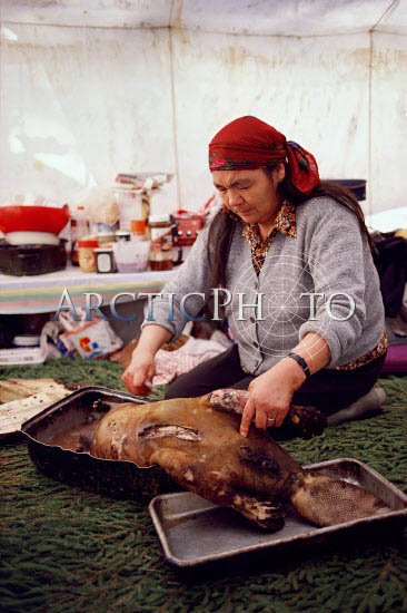 A Cree woman, Elizabeth Brien, preparing a beaver for a family feast. Northern Quebec, Canada. 1988