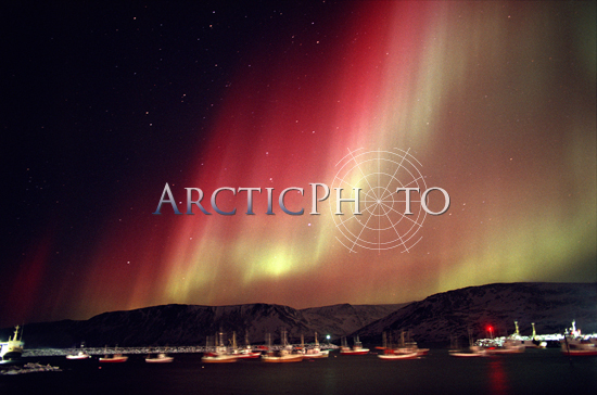 Aurora Borealis. Northern Lights. With rare red band. over the harbour at Skarsvag North Norway. 1990