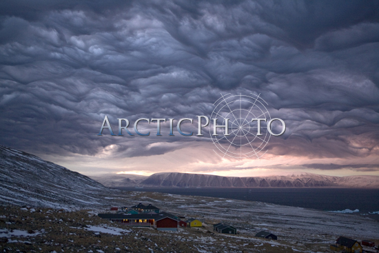 Dramatic Asperatus cloud formation as a storm builds at dawn over Qaanaaq, Inglefield Bay. Northwest Greenland. 2008
