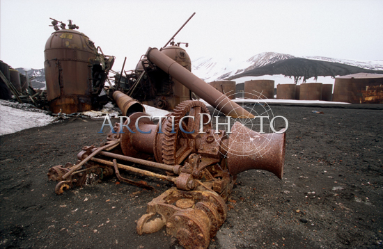 Rusting whaling equipment, winches, boilers and tanks on the beach at Whalers Bay. Deception Is. Antarctica.