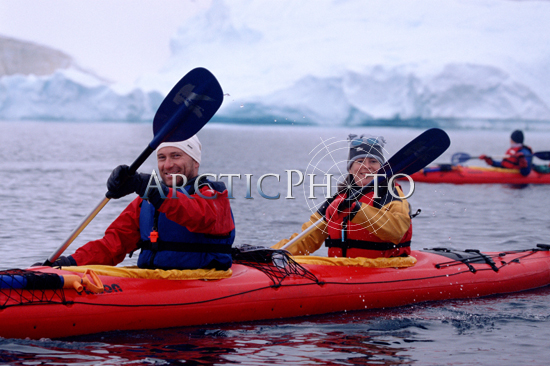 Happy tourists paddle a double kayak near Danko Island. Antarctica