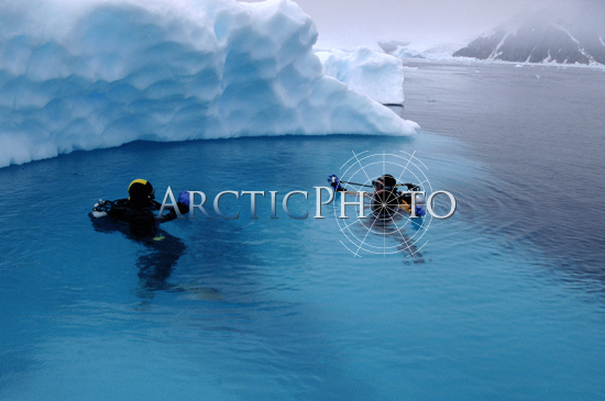 Divers close to a small iceberg while on a dive at Neko Harbour. Antarctica