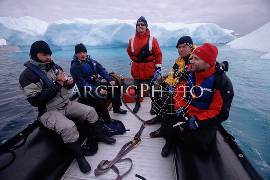 Passengers enjoy a zodiac ride around icebergs close to Pleneau Island. Antarctica