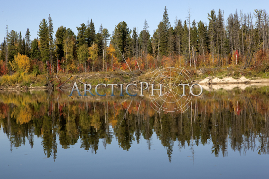 Mirror reflections of Boreal Forest trees in autumn colour, aspen, birch and willow, along the River Taz, Krasnoselkup, Yamal. Western Siberia. Russia.