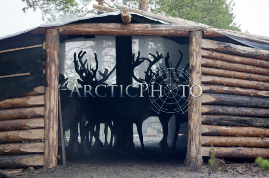 The Selkup light fires in wooden shelters for their reindeer. The smoke helps keep mosquitoes & black flies away. Krasnoselkup, Yamal, Western Siberia, Russia