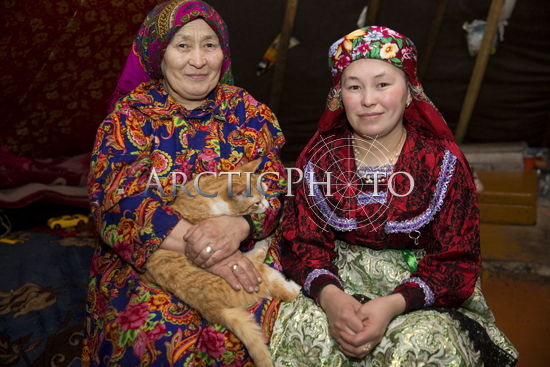 Marina Valeeva (right) a young Komi woman together with her mother, Marina Zatrueva, who is Khanty. inside her family's tent at a winter camp in the forest. Priuralsky District, Yamal, NW Siberia.